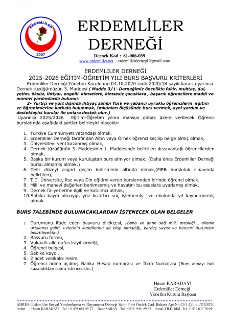 Erdemliler Derneğinin 2025-2026 Eğitim-Öğretim yılı Eğitim bursları aşağıda belirtilen hususlar çerçevesinde verilecektir. Burs miktarı ve sayısı ile verilecek kişilerin nitelikleri hususunda Dernek yönetim kurulu yetkili olup, burslar oluşacak bütçe ve imkanlar çerçevesinde verilecektir. Burs vermekten vaz geçme ve ya kriterleri değiştirme hakkı ve yetkisi dernek yönetimindedir.