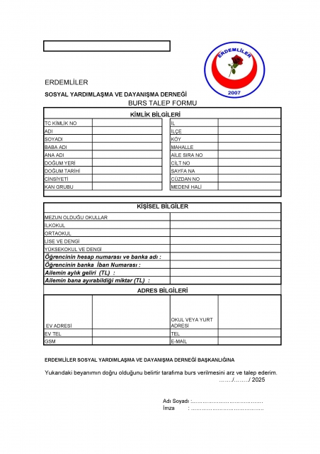 Erdemliler Derneğinin 2025-2026 Eğitim-Öğretim yılı Eğitim bursları aşağıda belirtilen hususlar çerçevesinde verilecektir. Burs miktarı ve sayısı ile verilecek kişilerin nitelikleri hususunda Dernek yönetim kurulu yetkili olup, burslar oluşacak bütçe ve imkanlar çerçevesinde verilecektir. Burs vermekten vaz geçme ve ya kriterleri değiştirme hakkı ve yetkisi dernek yönetimindedir.